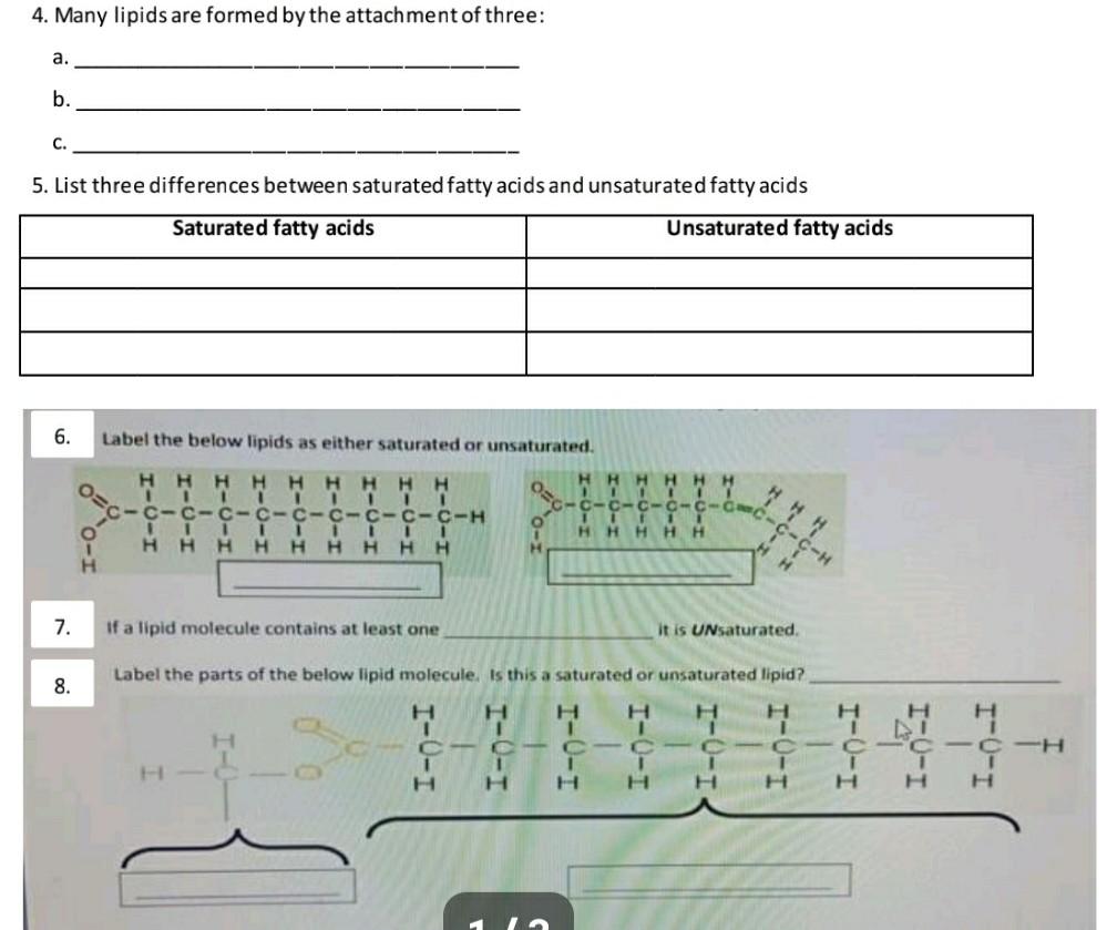 Os Label the below lipids as either saturated or unsaturated. Many lipids are formed by the attachment of three fatty acid chains to glycerol If all the carbon atoms in a fatty acid chain are joined by single bonds the lipid is said to. Fatty acids to a carboxyl group 4.
